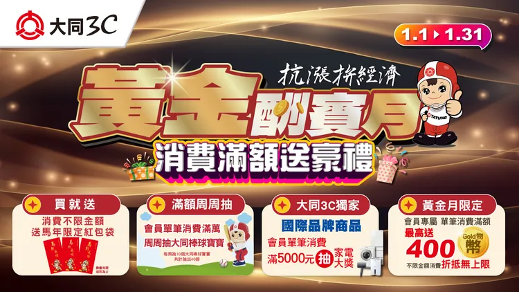 大同3C指出,黃金酬賓月期間祭出多項限時回饋,讓消費者「買得便宜、拿得更多」: