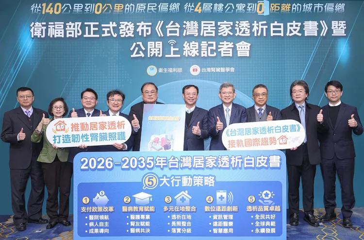 衛福部部長石崇良強調,未來醫療體系將從「醫院中心」轉型為「以家為核心」,建立醫療韌性、健康平權與永續經營三大支柱。白皮書設定2035年居家透析盛行率18%的目標,期望讓每位腎友都能在家中安全治療,不再被距離限制。召集人許永和指出,這項政策不只是數字目標,更代表病人生活自主權的落實。透過遠距智慧醫療與政策支持,病人生活與醫療需求將真正結合,實現「留在家裡的權利」,讓台灣居家透析成為全球典範。