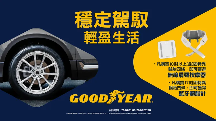 看準年節長途用車需求,固特異(Goodyear)推出新年限定回饋活動,從行車安全到日常放鬆同步升級,讓駕駛人在返鄉與出遊路上多一份安心。即日起至2/28止購買固特異輪胎四條即可獲得實用的好禮。購買18吋(含)以上輪胎四條,即可獲得無線肩頸按摩器一個;購買17吋輪胎四條,則可獲得藍牙體脂計一個。長途駕駛後舒緩肩頸疲勞,或在年後展開健康管理,都為新的一年增添實用價值。