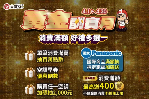 適逢春夏換季與消費趨勢轉趨保守,不少民眾也更傾向一次購足、集中比價。看準這波需求,大同3C即日起至4月30日推出年度檔期「黃金酬賓月」,主打六大回饋活動,從滿萬抽點數、滿額送家電,到空調早鳥優惠與會員點數加碼,搶攻換季商機。
