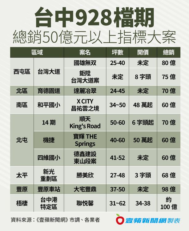 受到上半年房市景氣不明、推案遞延帶動,今年台中928檔期呈現「量揚價穩」、「大者恆大」現象,粗估總銷超過50億元以上個案大略就有9案之多,總戶數動輒300~500戶,清一色市區房價衝上5、6字頭、外圍郊區3字頭,惟買氣尚不明朗,不過業者老神在在說「來客、成交率降低,但現在才是正常市場。」
