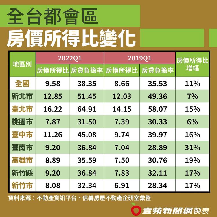 其中,房價所得比最高的台北市,一般家庭得16年不吃不喝才能買得起一間房子,增幅最大的是台南市,2019年第一季的房價所得比才僅7倍,今年第一季已經大幅拉高至9倍,增幅高達31%。