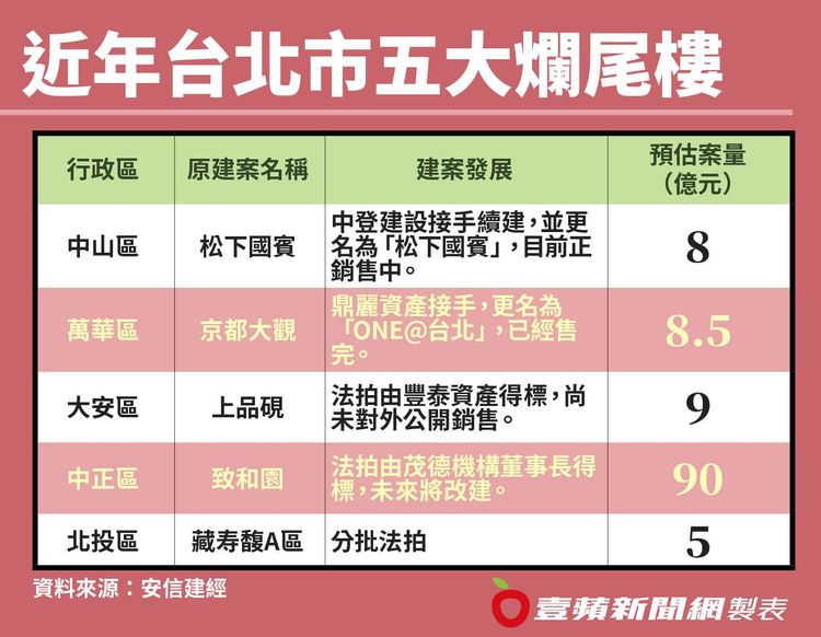 安信建經清點台北市近年5大爛尾樓動態,包括中山區「松下國賓」、萬華區「京都大觀」、大安區「上品硯」、中正區「致和園」與北投區「藏寿馥A區」等五個爛尾樓,預估合計案量逾百億元以上。