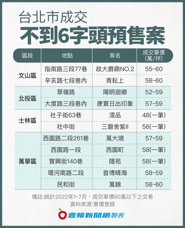【地產中心/台北報導】台北市新案動輒百萬,不過依據實價揭露資料,文山、萬華、北投、士林都有預售成交單價不到6字頭、甚至5字頭新案,房仲業者指出,台北市外圍地段或大眾運輸便利性較低的區域,仍有4、5字頭的中古大樓,當地新案若無特殊條件,價格拉升過高難以說服買方入手,因此部分成交價格能在60萬以內。