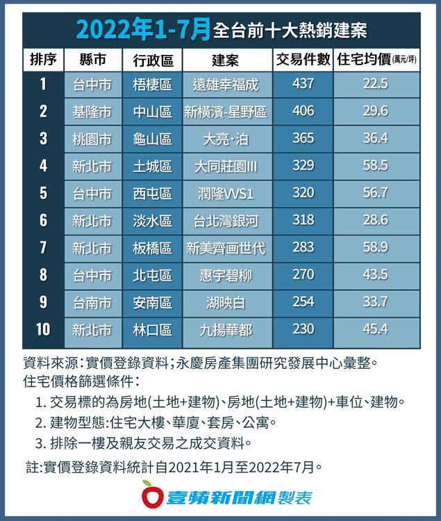 台中梧棲「遠雄幸福成」榮登預售熱銷建案榜首重劃區、重大建設、房價實惠加持,成為蛋白區預售案熱銷關鍵,永慶房產集團根據預售屋實價登錄資料,統計全台2022年1月至2022年7月前十大熱門交易建案,由台中市梧棲區「遠雄幸福成」拔得頭籌,交易量高達437件,其次則為基隆中山區的「新橫濱-星野區」和桃園龜山區的「大亮.泊」,交易件數分別為406件、365件。