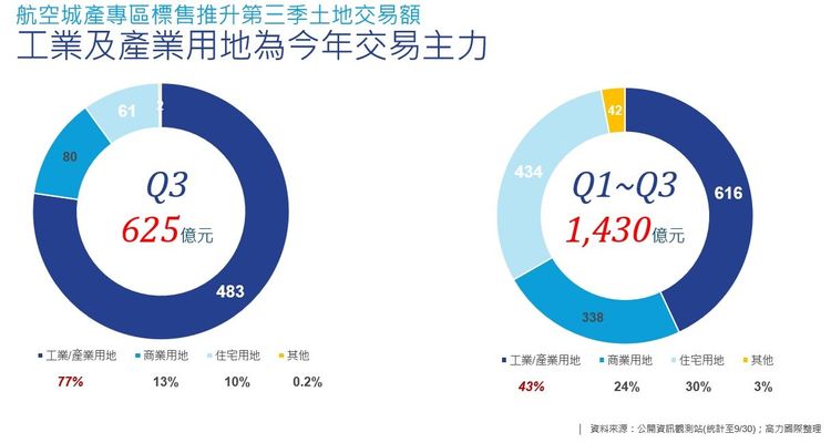 高力國際副董事總經理黃正忠說明,第三季因有桃園航空城產專區標售,吸引企業進駐儲備自用土地,推升單季交易額來到625億元,以工業、產業等用地一支獨秀。而今年連續升息已影響購屋意願,建商獵地追價的熱潮退燒,因此今年土地交易,呈現蠻大的衰退,已回到2018年的水準。