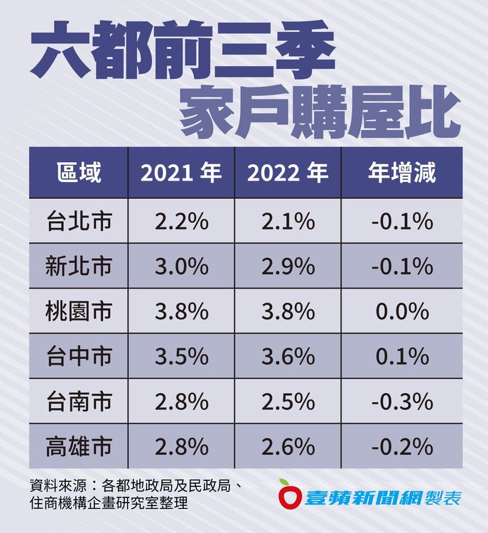 各都家戶購屋比桃園市買氣最高,今年前三季家戶購屋比3.8%,表示平均每一百戶中有3.8戶買房,台中市今年家戶購屋比3.6%,是六都中唯一逆勢成長的區域,南二都今年前三季家戶購屋比降幅較明顯,台南市購屋2.5%,年減0.3個百分點,是降幅最大的區域,高雄市家戶購屋比2.6%、年減0.2個百分點,雙北家戶購屋比都下降0.1個百分點,新北市2.9%,台北市2.1%,台北市這幾年人口外移嚴重,但家戶購屋比仍然是六都最低者。