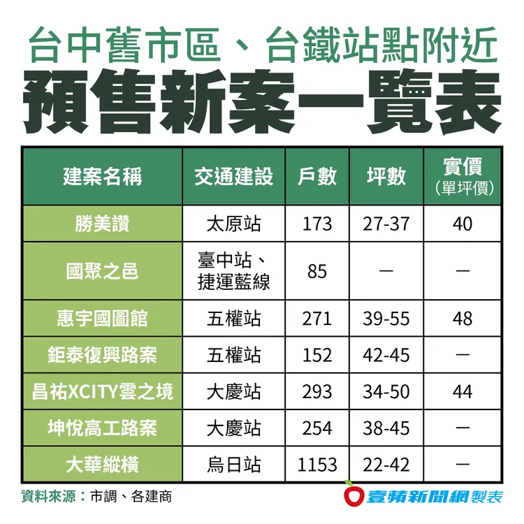 今年台中下半年南區預售新案幾乎沿著台鐵軌道呈帶狀分布,包括大慶站周邊的昌祐「XCITY雲之境」、坤悅「高工路新案」;五權站周邊的「惠宇國圖館」案、鉅泰復興路新案;以及靠近臺中站的國聚興大案等,年底房市正上演「大慶、五權、台中站」角力賽。