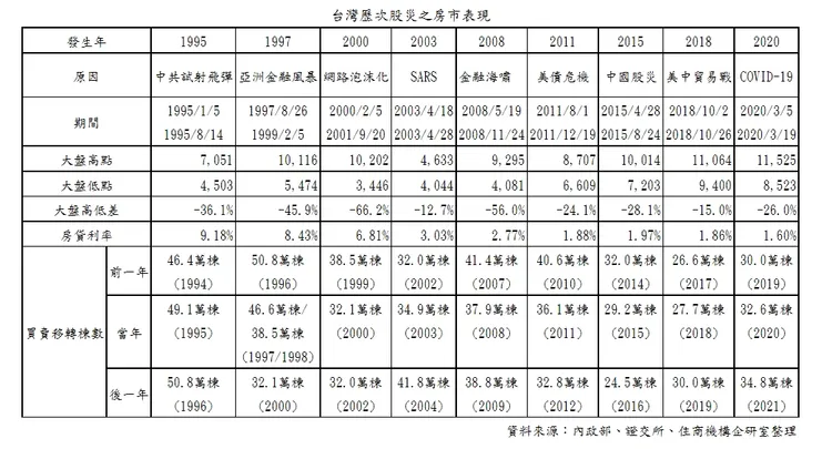 然而,若如1997年亞洲金融風暴與2000年網路泡沫,造成長時間的經濟傷害,股票市值大量蒸發,投資人受創慘烈,加上當時平均房貸利率超過6%,房市表現便難以期待。至於2015年中國股災隔年(2016)買賣移轉棟數僅24.5萬棟,創下歷史低點,則是因房地合一所得稅初上路,重挫房市信心,交易量急速緊縮,不過隔年因諸多區域房價盤整吸引買方回籠,當時並無打房新政,加上資金動能強勁,不動產市場立即谷底回升。