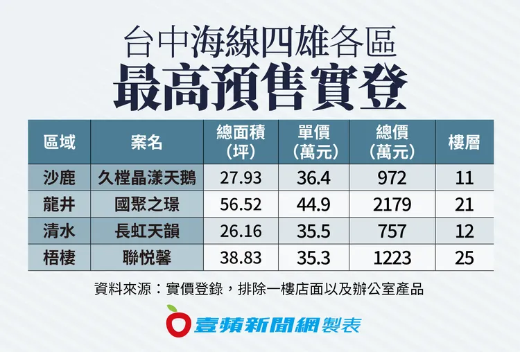根據實價登錄資訊顯示,近一年來海線四區預售案中的最高成交價,分別是清水「富宇大悦」的每坪32萬元、梧棲「精銳錦」的每坪34萬元、沙鹿「久樘晶漾天鵝」的每坪36萬元,以及龍井「國聚之璟」的每坪44萬元。