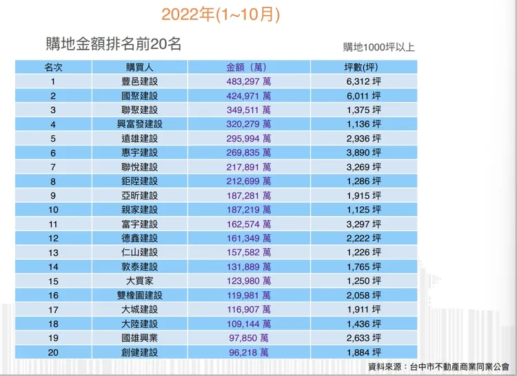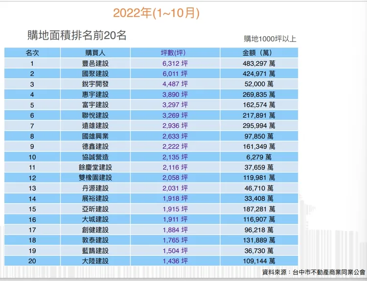台中市建築經營協會市場資訊主委白洪章指出,今年受到大環境因素、資金限縮影響,土地交易減緩,雖然今年尚未過完,但除非爆出單一大筆交易,否則排名大抵上差不多,整體來說地價仍處於上揚態勢。