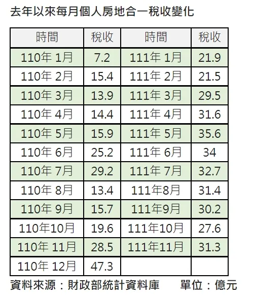 財政部統計顯示,今年11月個人房地合一稅收為31.3億元,年增約1成,不過今年稅收高峰落在5月的35.6億元,11月的個人房地合一稅收則擺脫連續5個月的下跌趨勢,回升到31.3億元。