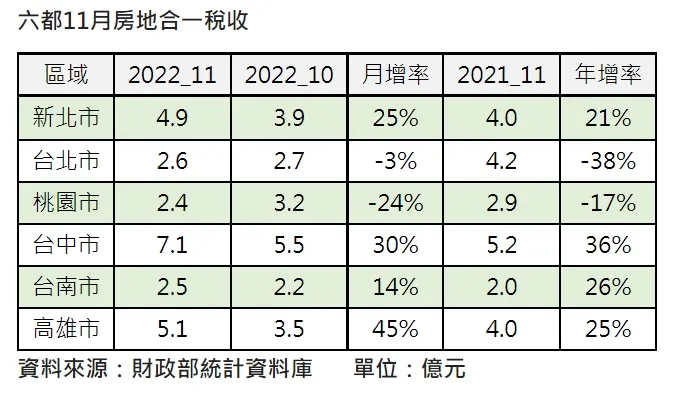 比較11月六都個人房地合一稅收,稅收最高的仍是台中市的7.1億元,月增幅達3成,其次則是高雄市5.1億元,月增45%,新北市4.9億元,月增25%,台南市為2.5億元,月增14%,南台灣的房地合一稅收11月都呈現月增。