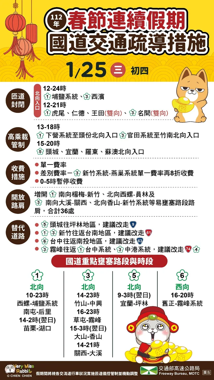 針對今日相關疏導措施,高公局指出,13-18時國1下營系統至頭份、國3官田系統至竹南,各交流道之北向入口高乘載管制、15-20時國5蘇澳、羅東、宜蘭及頭城交流道之北向入口高乘載管制,12-24時封閉國1埔鹽系統、國3西濱北向入口,12-21時封閉國1虎尾、仁德北向入口及國1王田、國3名間雙向入口,單一費率、國3新竹系統至燕巢系統採單一費率再8折收費、0-5時暫停收費、開放路肩、匝道儀控等。