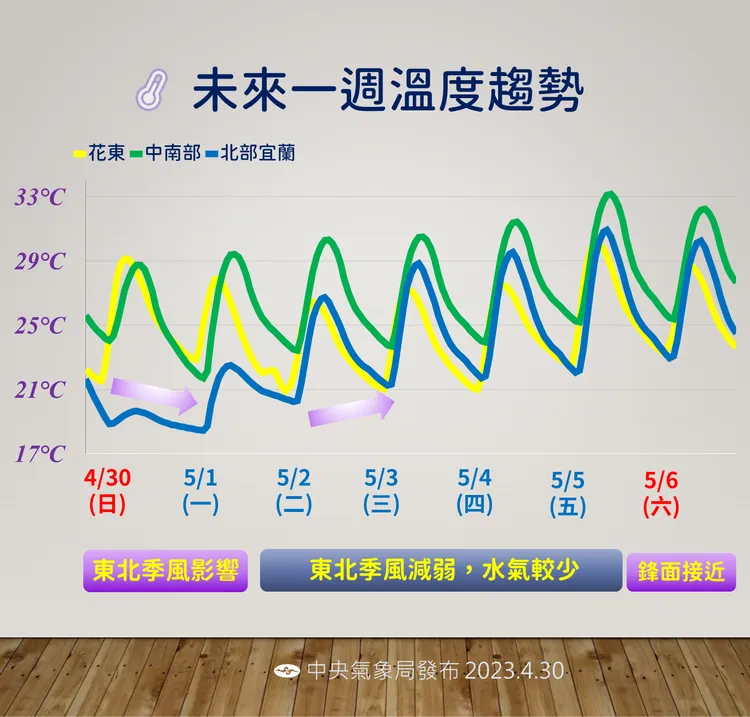 氣溫方面,氣象局預報顯示,周一(5/1)北臺灣感受依舊較涼,本島清晨最低溫出現在基隆七堵區15°C,北部白天高溫則在22至24°C左右,周二(5/2)至周五(5/5)隨著東北季風減弱,北部及東北部氣溫回升,各地有機會出現30°C以上高溫。