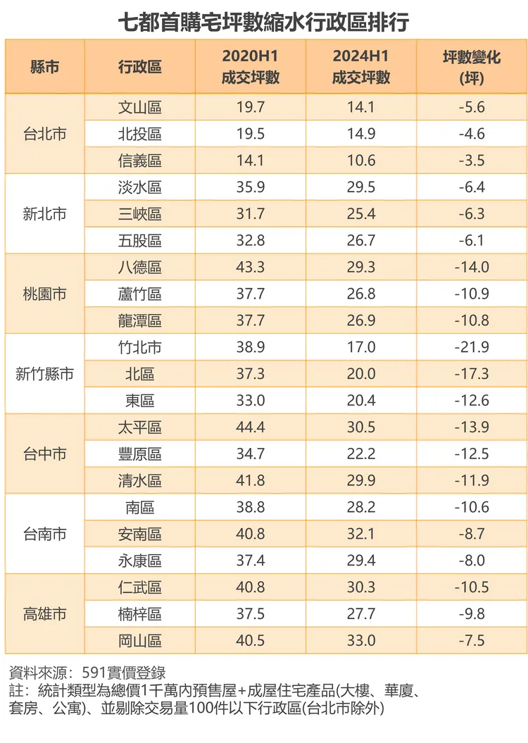 桃園則由八德、蘆竹、龍潭坪數縮小最多,尤其八德過去可以買到43坪,如今連30坪都買不到,八德因坐擁國道2號與3號,交通便捷,磁吸雙北通勤族以時間換取空間,近年又在捷運綠線、交流道增設、醫院進駐等議題下,帶動房價上漲,4年間能買到的空間足足減少14坪。七都坪數縮水最多的縣市則由新竹拔得頭籌,又以竹北、北區、東區等房價飆漲的區域明顯,尤其竹北減少坪數更是超過20坪,同樣預算4年前還可以買到2倍以上的空間,如今僅剩17坪,小宅化趨勢緊追北市。