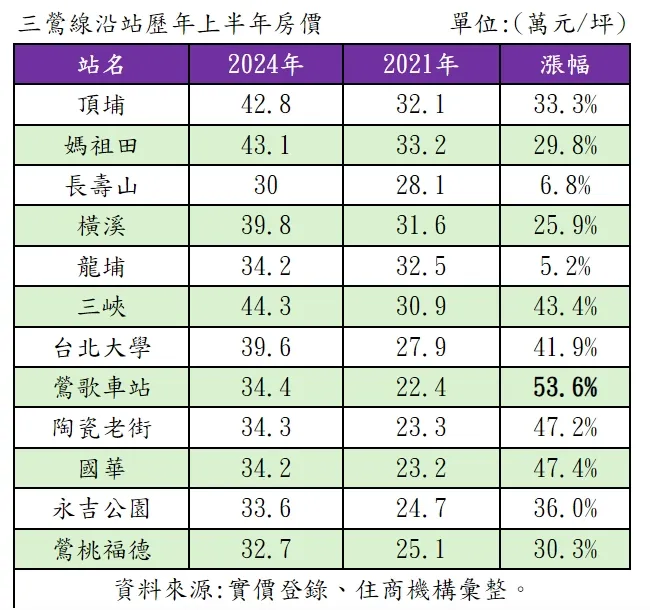 根據實價資料,住商機構盤點三鶯線沿線方圓2.5公里成交案件,比較各站點2021年與2024年房價差異,其中,沿線以鶯歌車站周邊房價漲幅最為驚人,2021年平均實價成交行情僅約2字頭,但到了近期平均房價已至每坪34.4萬元,漲幅約達53.6%。