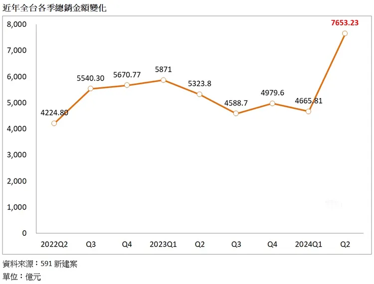 591新建案分析,受惠台股資金行情與新青安等利多,尤其本季在520檔期推波助瀾下,市場不斷上演建商狂加碼、買方不手軟的狂歡派對,若以上半年全台約1.2兆元量能來估算,儘管有央行限貸、新青安「一生一次」等管制走在前,估計仍難擋這股熱潮,全年有望突破2023年所締造2兆元高峰。