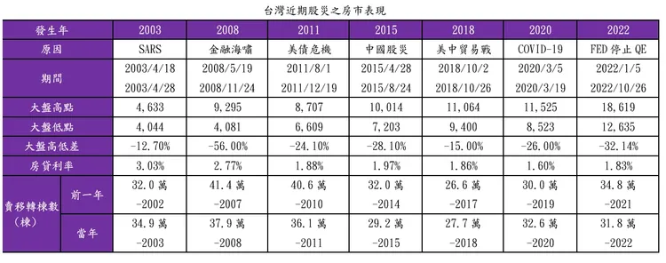 住商機構觀察自2003年SARS以來共7次股災,有4次股災當年度買賣移轉棟數出現下滑,其中與金融海嘯、美債危機、中國股災以及FED停止QE等國際經濟發展息息相關,住商不動產企劃研究室執行總監徐佳馨指出,從經驗判斷,股災短期雖然影響房市交易量,但真正影響房市的還是政策因素,以及當時的經濟背景。