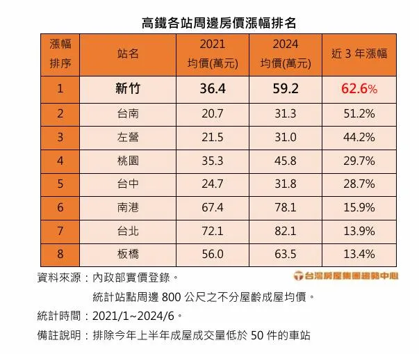 桃園站以29.7%的漲幅排名第四,均價來到45.8萬元,不過比起上一站板橋的63.5萬,和下一站新竹的59.2萬,桃園站為北台灣高鐵沿線的房價凹陷區,也讓消費者對桃園站所在的青埔,有更多房價補漲的期待。