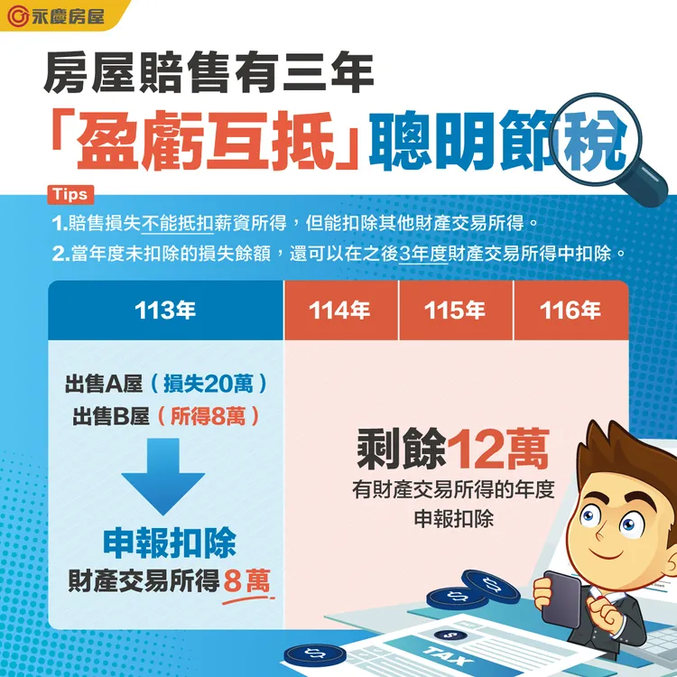 舉例來說,若在今年6月賣出A屋後,有賠售損失20萬元,但同年出售B屋有8萬元獲利。那麼今年度財產交易所得可申報扣抵8萬元,剩餘12萬元可以在114到116年度的財產交易所得申報中扣除。要注意的是,財產交易所得是無法直接與薪資所得相互抵扣。