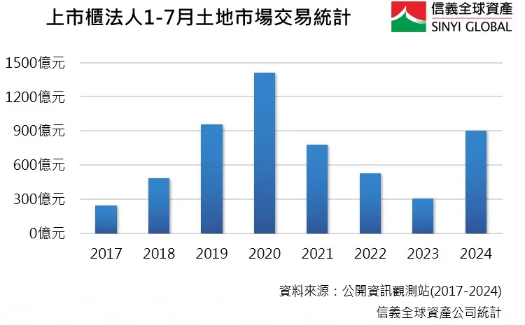 總計今年前七月土地市場交易量達901億元、年增198%,已超越去年一整年的交易量。林三智觀察,前幾年央行祭出選擇性信用管制,土地市場交易活動受到政策抑制,2021年起連續三年交易量都在千億元以下,去年僅有569億元,創14年以來新低,而今年建商看好住宅市場剛需,購地動能回歸並積極填補土地庫存,預料今年土地市場將重新站上千億元格局。