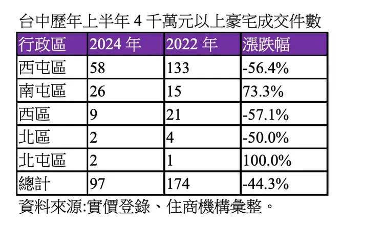 住商機構根據實價資料,統計台中市4千萬元以上住宅用華廈或住宅大樓交易,其中疫情後房市多頭的最高峰2022年時,上半年度全市有約174筆豪宅交易;不過,僅時隔3年,觀察2024年上半年台中市4千萬元以上豪宅交易案件下滑至97件,減幅高達44.3%。