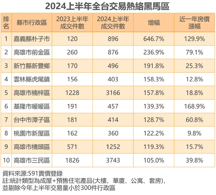 自台積電宣布於嘉科設廠,帶動區域房市起飛,嘉義朴子大爆冷門,上半年交易近千件,新建案「AI世界城」更一口氣挹注逾800戶交易,不僅如此,房價也由1字頭衝上3字頭,成為全台上半年房市大黑馬。居次的高雄前金同樣受惠科技題材助攻,上半年在輝達宣布進駐亞灣後,交易量對比去年同期成長2倍,新建案更叩關6字頭,創區域新高,讓該區房價短短一年內大漲8成。
