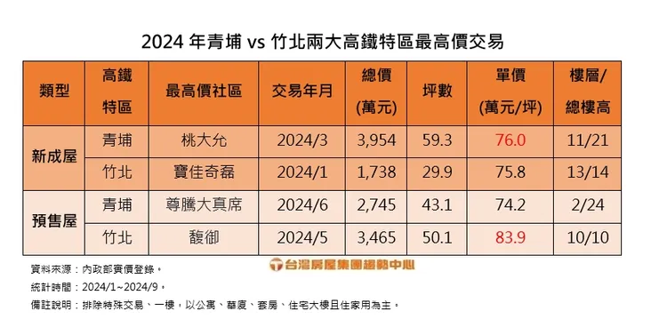台灣房屋集團趨勢中心執行長張旭嵐表示,青埔與竹北房價勢均力敵,主要是兩者有三大共通性,首先兩者皆為高鐵新興重劃區,吸引大量人口移入。再者,青埔的青溪里是桃園市最富裕的里,與竹北的中興里同樣為高收入族群聚集地。第三,加上青埔與竹北近年大型商業設施進駐,展現出宜居且具投資潛力的特點,兩地的重大建設不僅加強了各自的區域潛力,更重要的是,與雙北相比,桃竹的房價還是相對合理,因此吸引雙北買盤轉進桃竹,推動房市價量的穩定增長,使桃竹高鐵站區的高價雙雙突破7字頭。