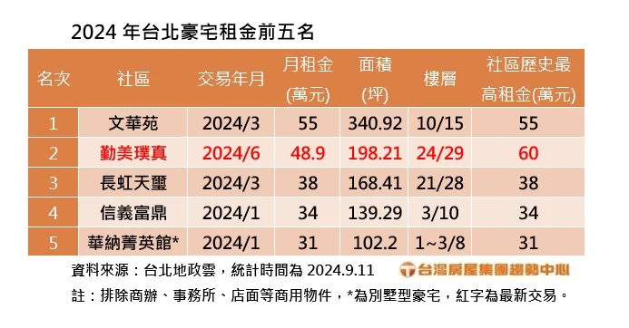 實價揭露,豪宅租金第三高的是內湖「長虹天璽」、月租38萬元,第四名為信義區「信義富鼎」、月租34萬元,第五名則是別墅型豪宅,租客一次租下「華納菁英館」的3層樓別墅,且一、三、四、五名的豪宅社區,皆創下同社區的總租金新高紀錄。