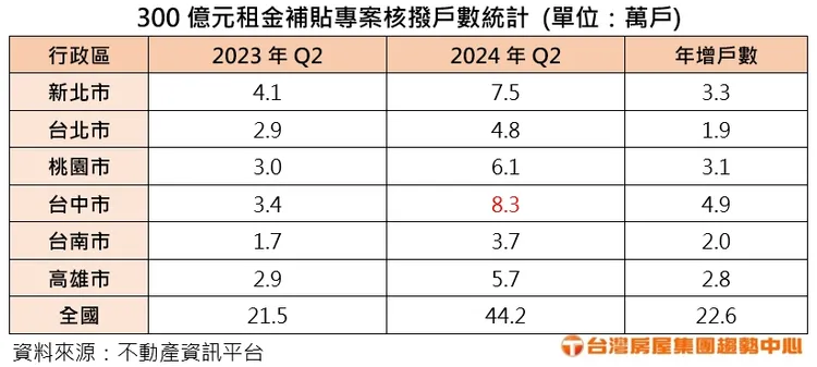 面對租金漲勢,政府300億元租金補貼政策也成了租屋族的及時雨,今年Q2租金補貼核撥戶數超過44萬戶,創下政策實施以來的新高,其中又以台中核撥8.3萬戶最多。