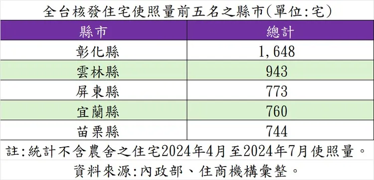 根據內政部數據,觀察各縣市自2024年4月起,截至最新資料2024年7月為止,所核發純住宅使照數量以彰化縣達1,648宅最多,大家房屋企劃研究室公關主任賴志昶認為,彰化縣近期受惠於台中房市外溢,房價成長幅度有目共睹,同時在疫情過後台商回流,本身即有不少傳產「隱形富豪」的彰化縣,換屋需求有待滿足,為當地創造不少市場,吸引建商加碼進駐,為區域新案市場創造供給,但疫情後這波交屋潮適逢限貸風波,恐讓區域新案市場遭遇不小衝擊。