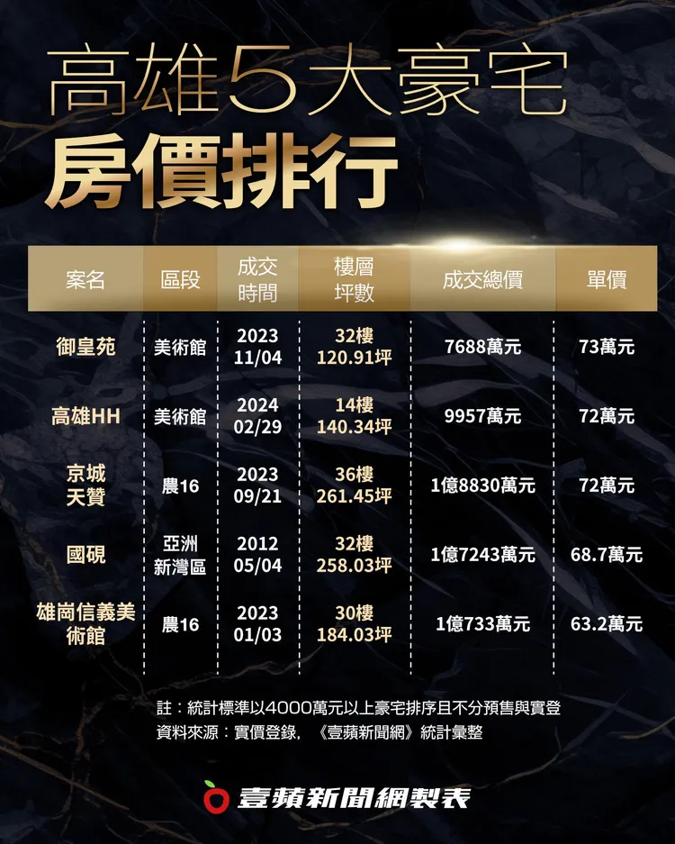 另今年2月美術館屋齡8年豪宅「高雄HH」,14樓坪數140.34坪豪宅,內含2個平面車位,以總價9957萬元成交,若拆算車位後每坪成交單價72萬元,與「京城天贊」並列高雄最貴成屋。