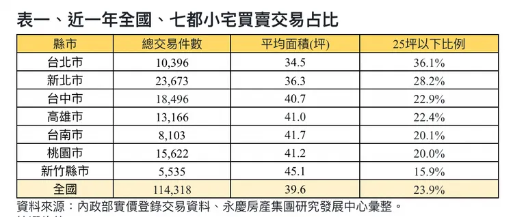 台北市近一年25坪以下房屋占比高達36.1%,相當於每三件交易就有一件小宅。永慶房屋研展中心副理陳金萍表示,台北市房價居高不下,使不少購屋族群在預算有限下,選擇坪數較小、總價較低的房屋,房貸負擔也相對輕鬆。此外,台北市也有許多北上就業、就學的族群,擁有龐大的租屋需求,因此,親民實惠的小宅在租賃市場頗受投資、置產族群的喜愛。