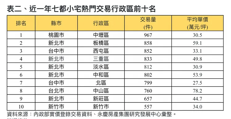 若從七都近一年小宅熱門交易行政區來看,中壢區以967件奪七都之冠。陳金萍指出,中壢區因坐擁機場捷運、青埔高鐵站、中壢火車站等地利優勢,再加上當地居住人口眾多及工作機會多,長年房市需求穩定。而且,當地有許多小坪數的物件可供選擇,讓不少首購自住、置產投資買盤駐足。
