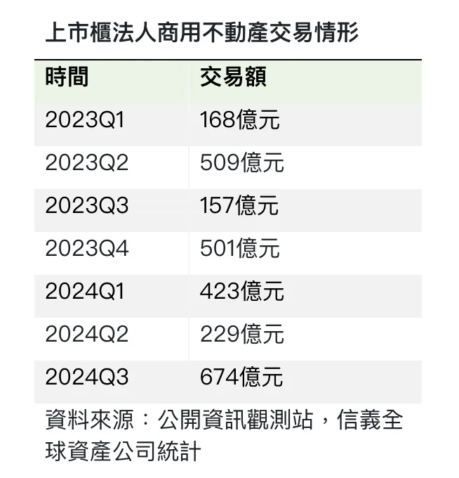 信義全球資產公司發布商用不動產市場調查,第三季上市櫃法人商用不動產交易量達674億元,較去年同期成長329%,其中工業不動產受惠於人工智慧、高效能運算等需求增加,帶動廠房、工業土地交易熱度持續攀升,成交金額達545億元,占據本季81%的交易量;辦公市場有辦公空間擴充、成立企業總部等剛性需求支撐,交易續穩,累計交易量達129億元。