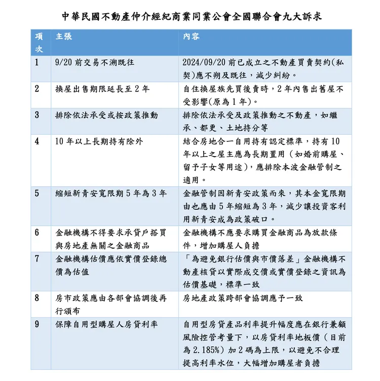 為此,房仲全國聯合會理事長王瑞祺召集房仲全國聯合會不動產智庫總會長林金雄、會長 張欣民暨全體委員討論後,提出九大訴求,包括9/20前完成契約交易者不溯及既往,以及「先買後賣」之換屋期限從1年延長為2年、縮短新青安寬限期為3年、持有房屋達10年以上者應排除在本波信用管制之外、金融機構不應要求承貸戶購屋與房地產無關之金融商品,以及保障自用購屋者之房貸利率地板價加2碼為上限等9點。