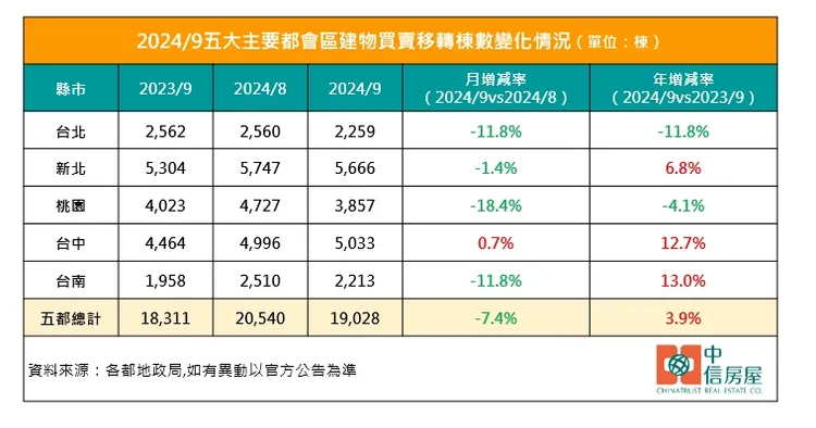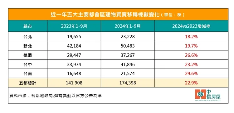 進一步觀察2024年前三季六都建物買賣移轉棟數表現,台北市23,228棟、年增18.2%,新北市50.483棟、年增19.7%,桃園市37,267棟、年增26.6%,台中市41,846棟、年增23.2%,台南市21,574棟、年增29.6%,五都總計174,398棟、年增22.9%。