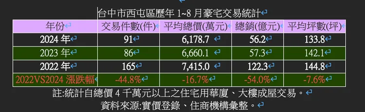據實價登錄資料,西屯區2024年1~8月總價4千萬元以上交易物件共達91件,平均總價6178.7萬元,總銷約達56.2億元,雖說交易量體與2023年同期相比有些許成長,但若對比近年來豪宅交易高峰的2022年,交易件數、平均總價及總銷皆下滑不少,其中交易件數更下滑達44.8%、總銷下滑54%。