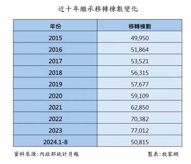 我家網總監李欣諭表示,2015年以前,全年繼承數量都不到五萬棟,近年繼承移轉量高,到2023年創下7.7萬棟的新高,主要因為民國38年後出生的戰後嬰兒潮走入晚年凋零,加上多數觀念傳統的長輩不願生前贈與或處分,多留到身後繼承分產,因此近年繼承移轉量逐年增加。