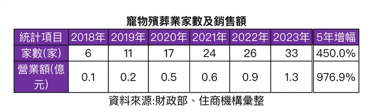 據財政部資料,全台2023年寵物屍體處理業營業家數達33家、營業額達1.3億元,雖然占比僅占整體殯葬業僅分別約0.7%、0.5%,但比較2018年同期數據,5年營業家數、營業額漲幅高達4.5倍與近9.8 倍,顯示隨毛經濟範圍持續延伸。