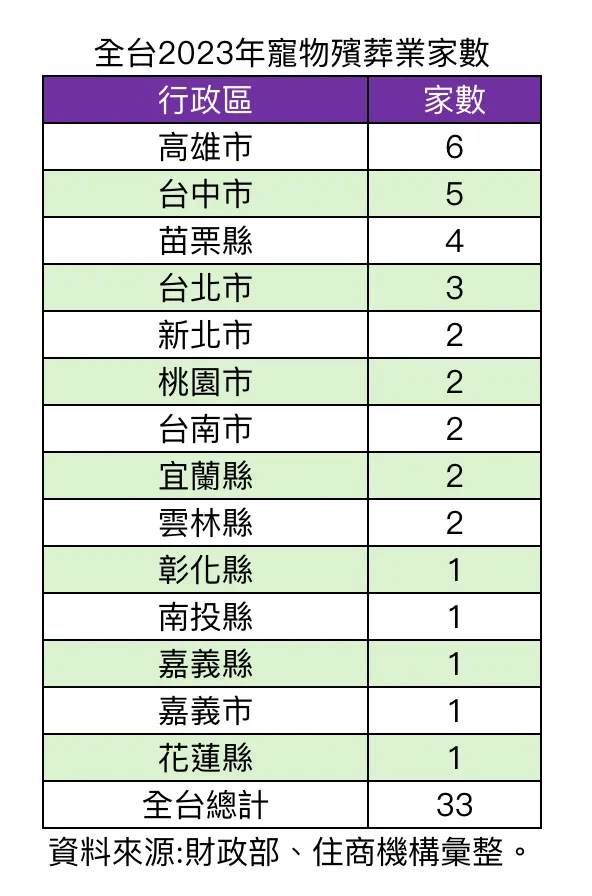 住商機構盤整財政部統計發現,全台各縣市寵物殯葬業營業家數以高雄市獨占鰲頭,2023年該產業營業家數高達6家;台中市則次之,2023年寵物殯葬業家數達5家;之後為苗栗縣、台北市,寵物殯葬業家數分別為4、3家。賴志昶指出,從官方數據可觀察到,全台「寵物送行者」占比仍算相對少數,惟近年來成長幅度相當可觀,且產業高度集中於中南部都會區與周邊縣市,主因除都會區有較多相關「毛小孩」商機,且此類型產業需遠離人口的較大腹地,而台中、高雄以及苗栗有較多可開發郊區,寵物臨終送行商機在當地持續加溫。