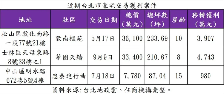 據台北地政雲揭露,松山區豪宅「敦南樞苑」21樓戶總坪數約233.7坪,5月以總價3億6100萬元成交,對比上一手取得總價,原屋主移轉獲利高達3,907萬元;此外,天母指標豪宅「華固天鑄」33樓戶,總坪數約210.7坪,9月以總價3億3400萬元成交,比較前手入手總價,換算前屋主轉手大賺4,743萬元;無獨有偶,大直豪宅「忠泰進行曲」4樓戶總坪數約87坪,7月以7780萬元轉手,觀察原屋主入手總價,換算移轉換利達980萬元。