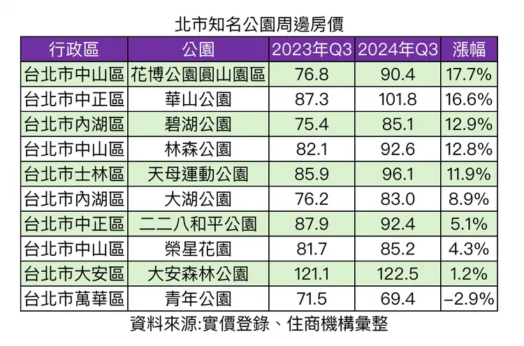 住商機構觀察實價登錄資料,比較2023年第三季與2024年第三季,北市十大公園方圓2.5公里周邊交易行情。其中,位於大同、中山區交界的花博公園周邊,今年第三季平均房價高達每坪90.4萬元,與去年同期相比漲幅達17.7%,漲勢驚人,賴志昶指出,花博公園周邊過去較屬北市蛋白區,惟受惠於北美館、花博公園等休憩機能俱全,又有鄰近捷運圓山站優勢,吸引部分建商進駐推動都更,且近年來花博公園鄰近的大同區新案價位持續高漲,推升周邊房價走勢,令該公園區域價位高升。