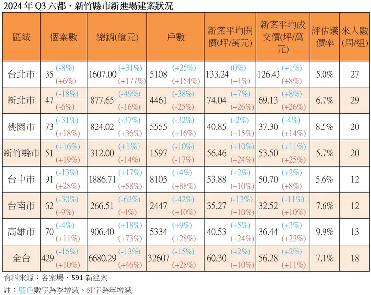 591新建案分析,Q3延續上半年氣勢,加上去年同期受《平均地權條例》修法等因素影響基期較低,整體供給仍有一定水準。像台北市在蛋黃區不敗題材加持下,建商仍延是火力全開,在文山、南港及北投等區都可見逾百億案量挹注,總銷一舉突破1600億元,較去年同期成長1倍多,供給戶數亦衝出單季新高。