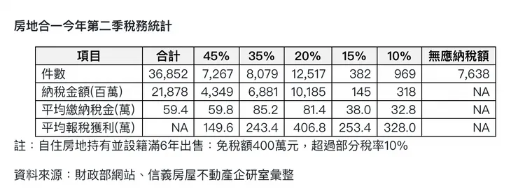 件數最多的是20%的稅率,今年第二季達1.25萬件,年增30%,平均繳納稅金為81.4萬元,回推獲利金額達407萬元;至於短期交易也有19.7%案件數適用45%稅率,持有時間在兩年以內;另外房地合一稅率35%的占比也有21.9%,持有時間在2~5年。在房價大漲後,短期交易的比例並不低。