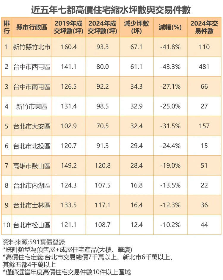 對比2019年,豪宅坪數又以新竹和台中縮水最明顯,一舉奪得榜上前4名,其中新竹竹北豪宅消風最多,5年前可以買到160坪,今年只剩不到百坪,整整減少67坪,減幅同樣超過60坪的還有台中西屯,今年只剩80坪,主因在於兩地近年房價高漲,然而豪宅線仍維持4千萬,導致不少換屋型產品意外成為豪宅,造成高價住宅交易坪數明顯下滑。