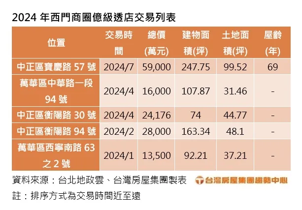 台灣房屋集團趨勢中心進一步觀察,今年西門商圈的整棟億級透天店面交易,共有5筆,累計交易金額破14億,張旭嵐分析,台北車站仍然是台北的交通重要樞紐,結合台鐵、高鐵、捷運等三鐵共構,可說是人流轉運的必經之地,也帶動相鄰的衡陽路和西門町商圈觀光人潮。 另外,捷運松江南京商圈也有店面交易,9月成交1樓約89坪店面,總價2.07億元、單價232.9萬元,買方同樣以現金入手,目前該店面由連鎖便利商店經營中。