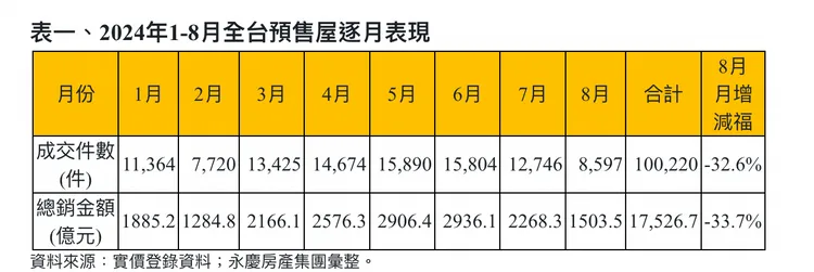 內政部實價登錄數據顯示,2024年1-8月的預售住宅交易件數達到100,220件,對比去年同期的61,962件,增幅高達61.7%。在總銷金額上,2024年前8個月全台預售住宅總銷高達1.75兆元,較2023年同期的9514億元,成長幅度高達84.2%。