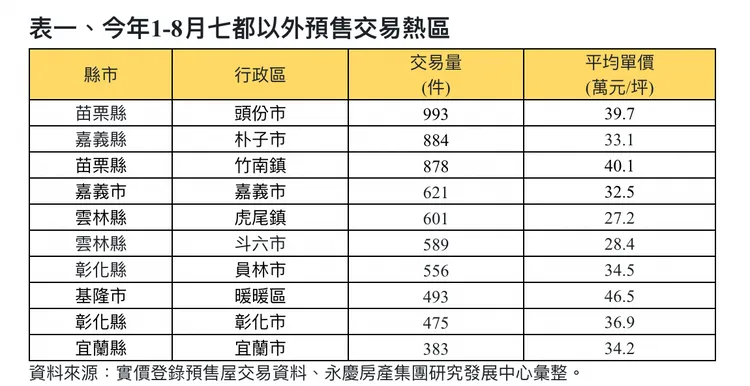 位於苗栗縣北側的頭份市與竹南鎮,受惠於竹科外溢的剛性買盤,今年1-8月的預售交易火熱,交易件數分別為993件和878件。永慶房屋研展中心副理陳金萍表示,新竹縣市因腹地受限,新增供給有限,在供不應求的狀況下,鄰近竹科的區域如頭份市、竹南鎮也因外溢效應,房價跟著水漲船高,且購屋族群大多屬高所得的科技新貴和工程師,房價負擔能力強。
